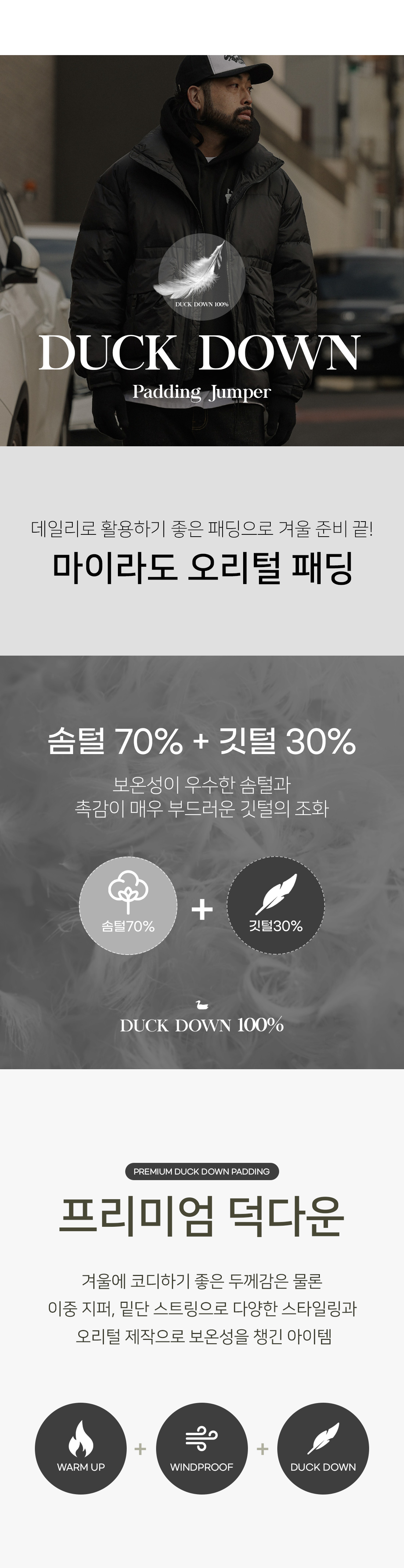 데일리로 활용하기 좋은 패딩 입니다. 지금부터 초봄까지 착용하기 좋은 두께감은 물론 오리털 함량으로 보온성이 좋고 앞면의 포켓 쉐입 포인트와 투웨이 집업, 밑단 스트링으로 제작되어 취향에 따라 캐주얼룩, 홈웨어룩, 스트릿룩 등 여러 연출이 가능하고 핏 또한 살짝 오버핏으로 좀 더 여유 있는 착용감을 느끼실 수 있습니다. SIZE L-XL,2XL-3XL 모델착용 [KIHOON]색상 : 블랙 / 사이즈 : L-XL ![]() ![]() ![]() ![]() ![]() ![]() ![]() ![]()