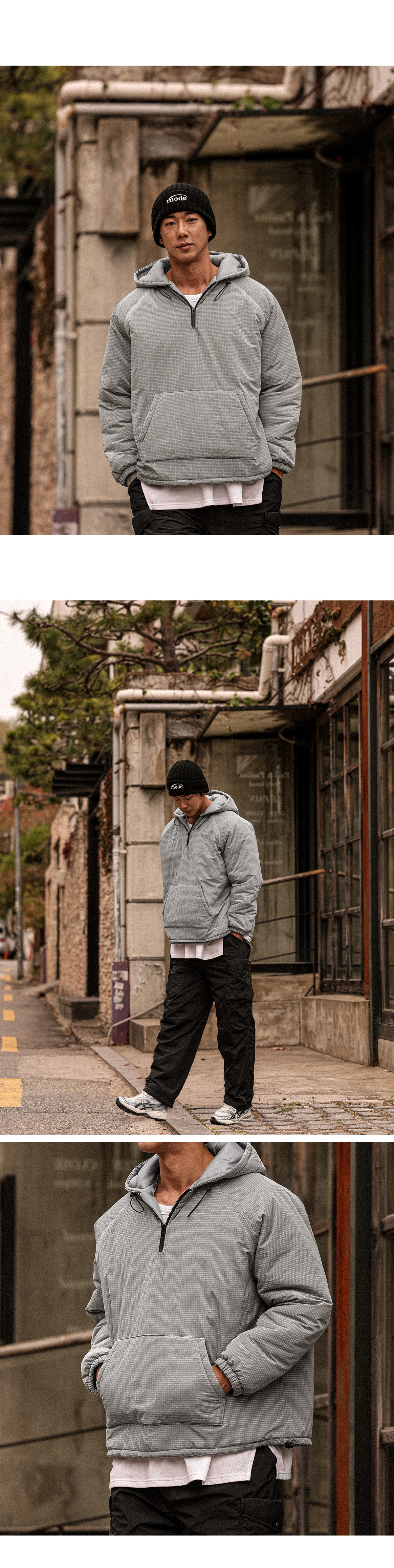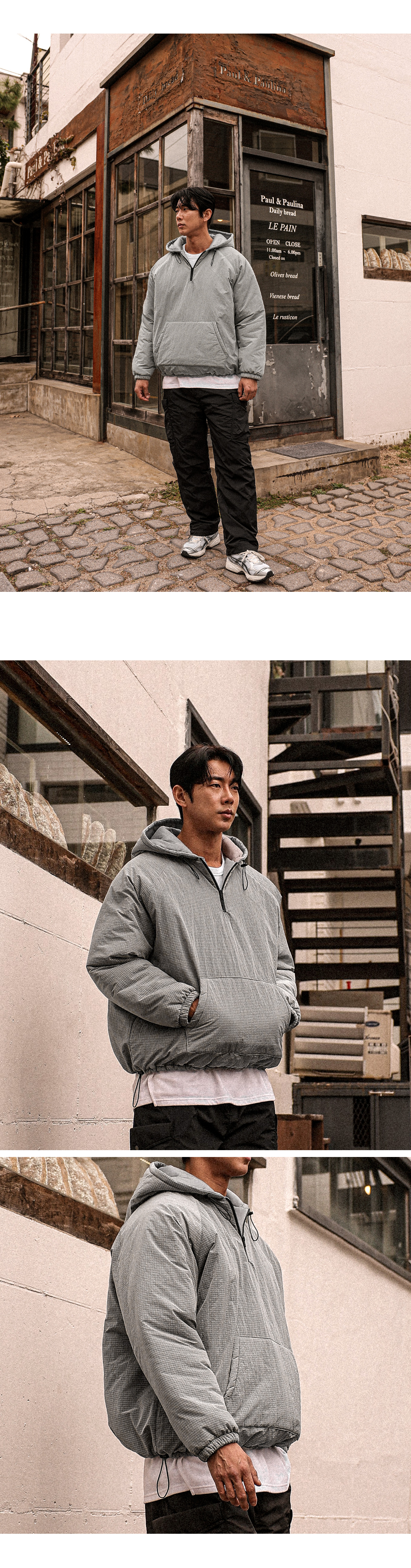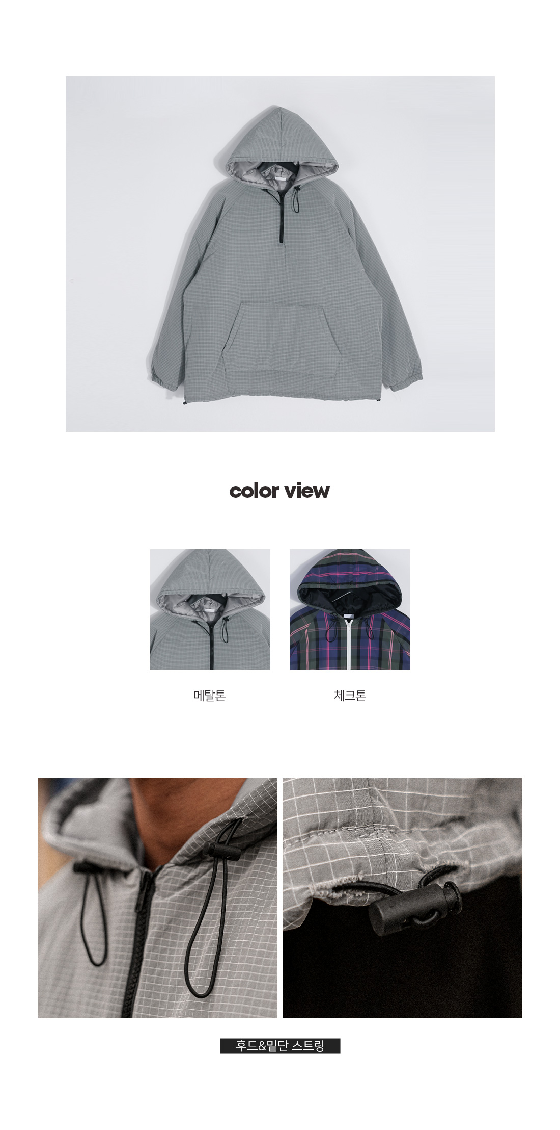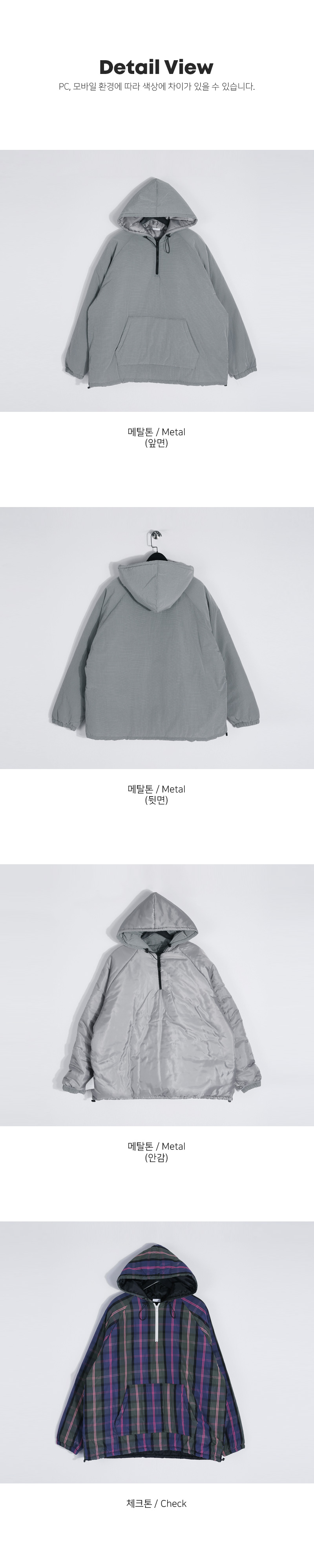 아노락 형태의 후드 패딩 입니다. 겨울내내 활용하기 좋은 4온스 충전재로 보온성이 좋고 안에 기모 반팔,기모 맨투맨등 레이어드해 캐주얼하면서 스트릿한 느낌을 주는 아이템이며 핏 또한 오버핏으로 좀더 여유있는 피팅감을 느끼실수 있습니다. SIZE FREE 모델착용 [JUNBEOM]색상 : 메탈톤 / 사이즈 : FREE ![]() ![]() ![]() ![]() ![]() ![]() ![]() ![]()