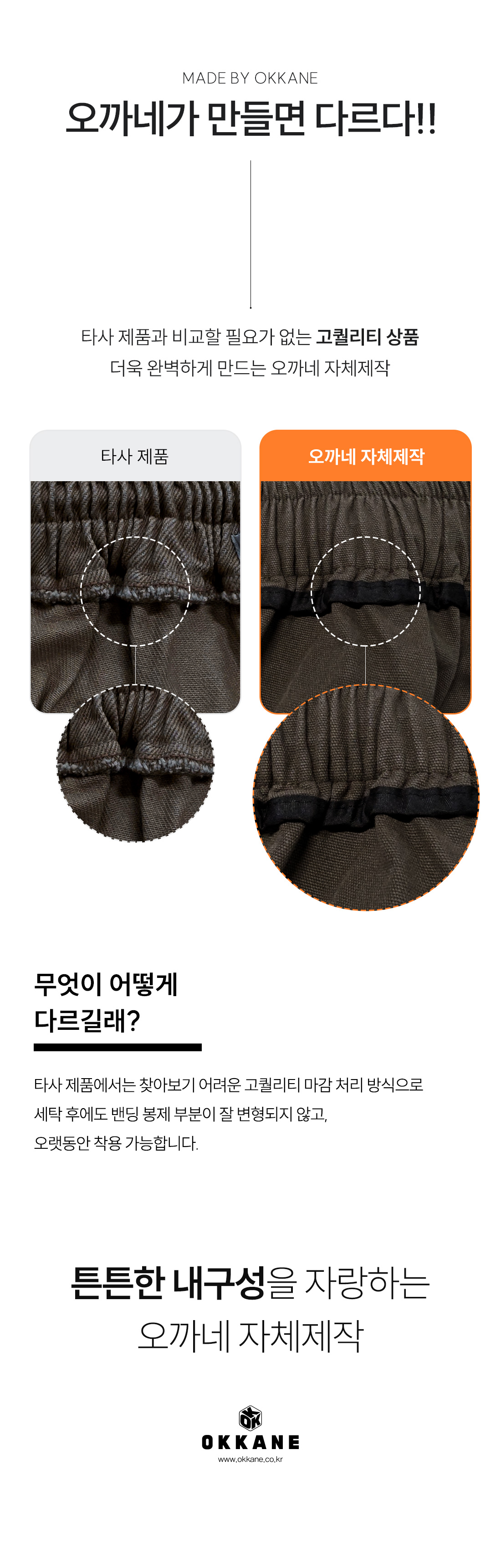 디자인과 편안함을 동시에 갖춘 오까네만의 밴딩 팬츠입니다. 허리 밴딩에 벨트 고리가 더해져 실용적인 디자인은 물론, 안쪽 마감 처리까지 오까네의 기술력으로 더욱 견고하고 오래 착용할 수 있게 제작 되었습니다. 적당한 두께감과 여유 있는 세미와이드핏에 무릎 부분의 파라슈트 디자인과 밑단 스트링이 더해져 캐주얼하면서도 힙한 무드를 연출합니다. 셋업 셔츠와 함께 또는 단품으로 면 자켓, 바람막이 점퍼, 맨투맨 등 다양한 아이템과 코디가 가능해 추천드리는 아이템입니다. SIZE L-XL,2XL-3XL 모델착용 [YOOJUN]색상 : 딥브라운 / 사이즈 : L-XL
