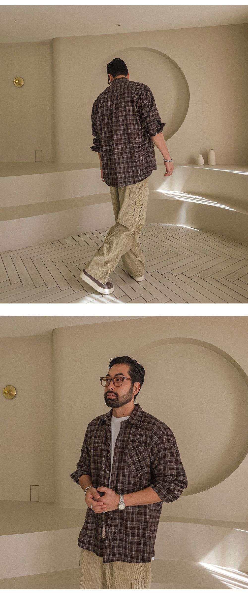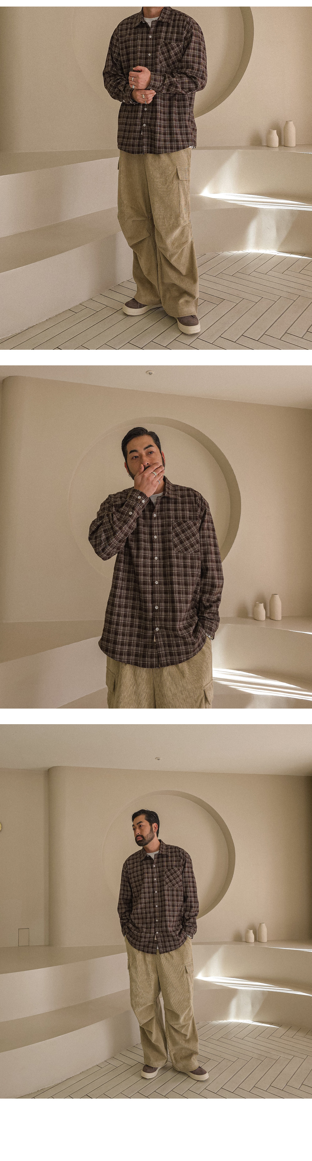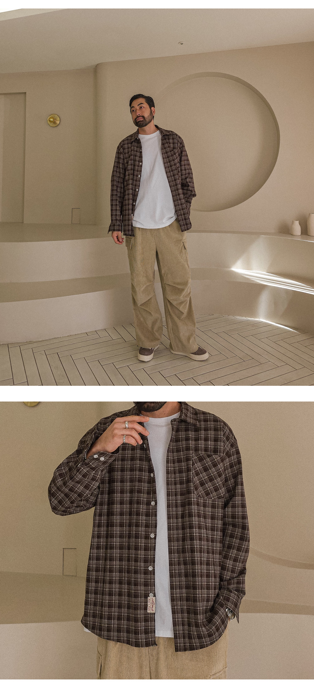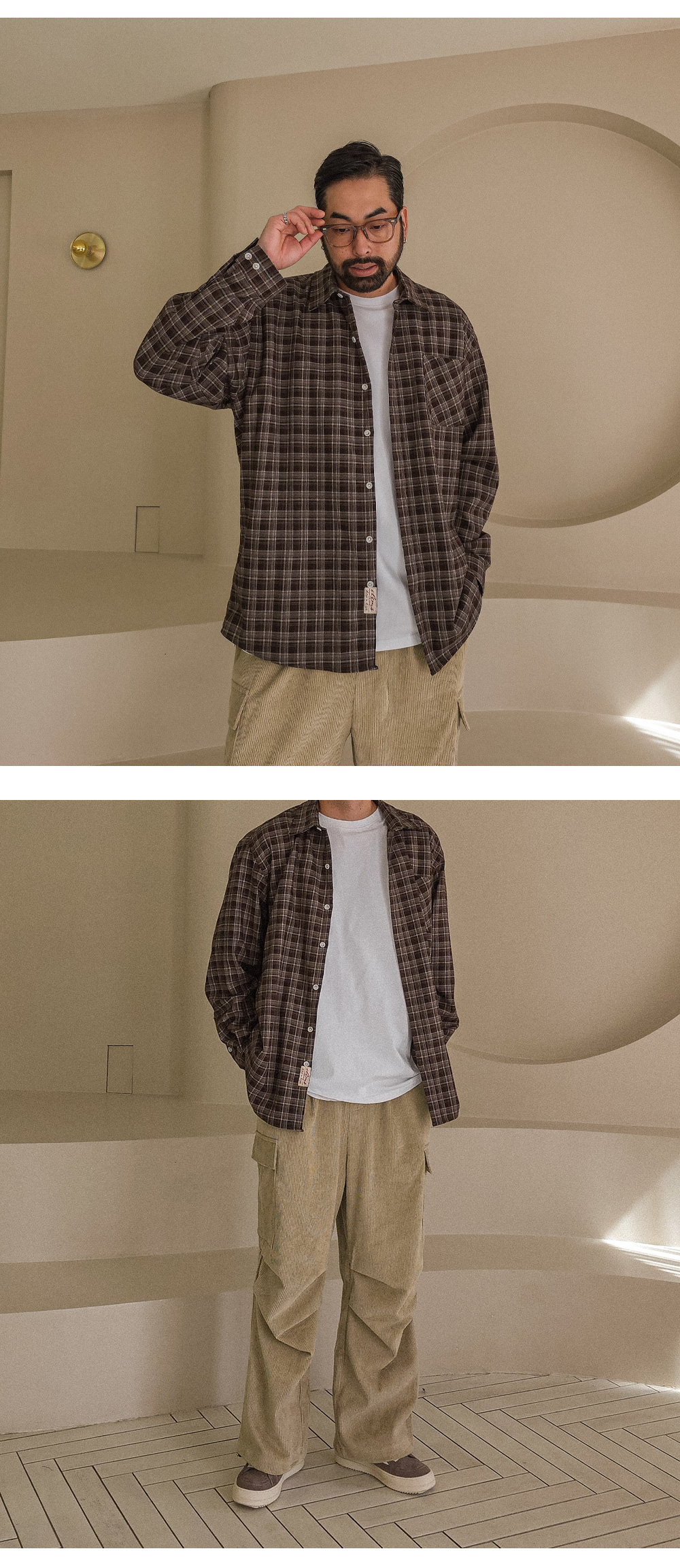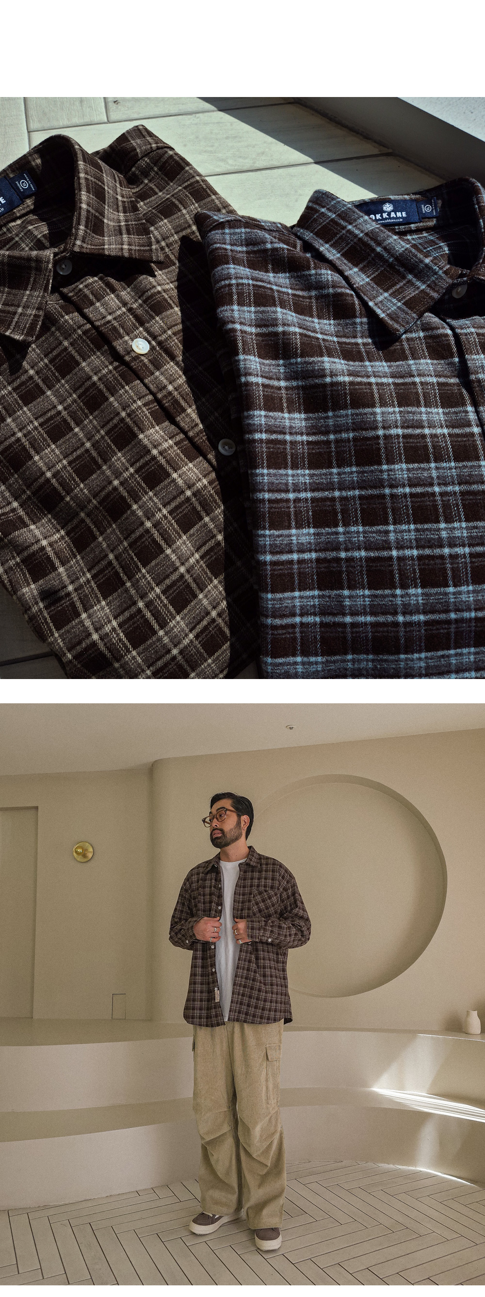 오까네에서 선보이는 따뜻한 분위기의 체크 패턴이 돋보이는 셔츠입니다. 세미 오버핏 실루엣으로 제작되어 여유 있는 착용감과 자연스러운 실루엣을 연출합니다. 단추 아랫부분에 들어간 패치 디테일이 은은한 포인트가 되어 밋밋함 없이 감각적인 무드를 더해줍니다. 아우터처럼 가볍게 걸쳐 스타일링하기에도 좋은 아이템입니다. 체크 특유의 클래식함에 캐주얼한 무드가 더해져 다양한 하의와 손쉽게 매치할 수 있어 활용도가 높습니다. SIZE L-XL,2XL-3XL,4XL-5XL 모델착용 [KIHOON]색상 : 브라운톤 / 사이즈 : L-XL ![]() ![]() ![]() ![]() ![]() ![]() ![]() ![]()