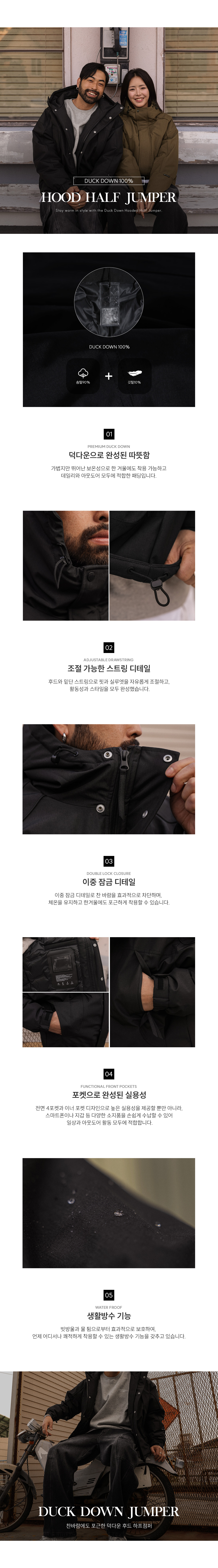 베이직하면서 심플한 무드의 덕다운 하프 점퍼입니다. 가볍고 촘촘한 조직감으로 견고한 내구성을 자랑하며 고급 오리털 충전재를 사용해 가볍지만 뛰어난 보온성을 제공합니다. 전면 4 포켓으로 높은 실용성은 물론, 밑단과 후드 스트링 디테일로 취향에 맞게 실루엣 조절이 가능합니다. 이중 잠금 디테일로 찬 바람을 효과적으로 차단하며, 여유 있는 루즈핏으로 트렌디함과 동시에 편안한 착용감을 선사합니다. SIZE M-L,XL-2XL,3XL-4XL,5XL-6XL,7XL 모델착용 [남자모델]색상 : 블랙 / 사이즈 : XL-2XL [여자모델]색상 : 브라운 / 사이즈 : M-L ![]() ![]() ![]() ![]() ![]() ![]() ![]() ![]()