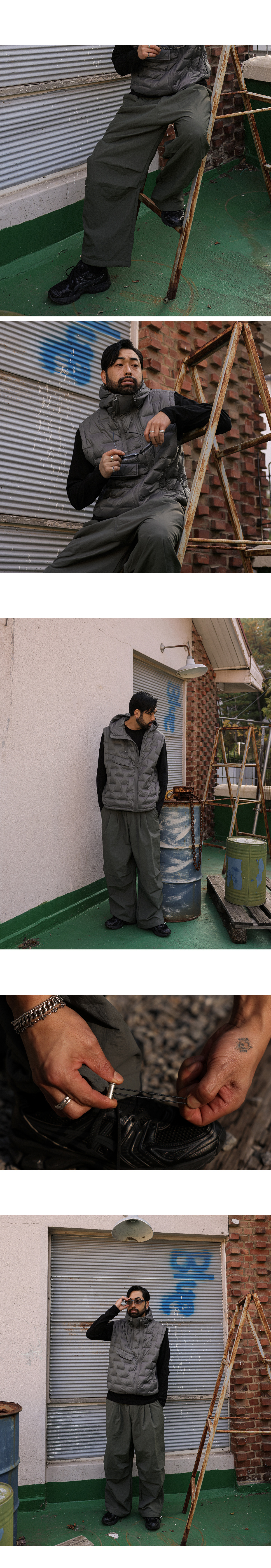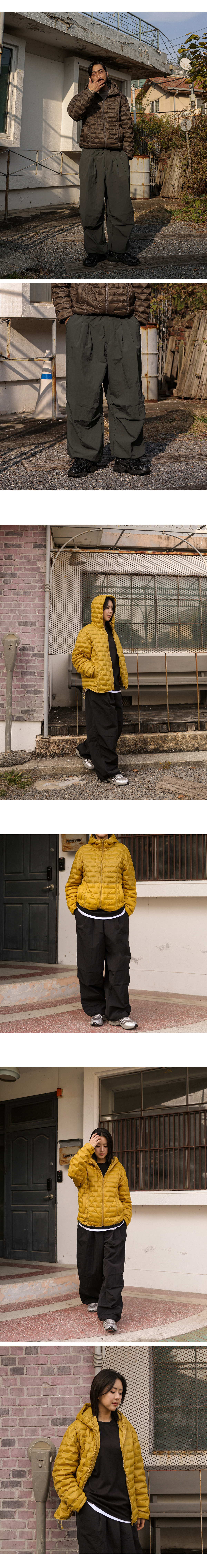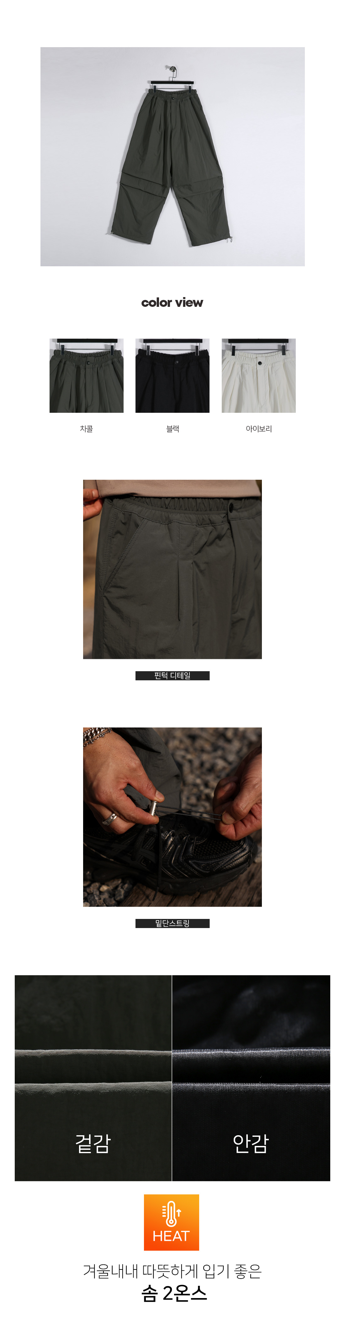 겨울 시즌 필수템인 패딩 팬츠입니다. 탄탄한 나일론 100% 원단으로 제작되어 내구성이 우수하고 선명한 컬러감이 돋보입니다. 고밀도 충전재가 더해진 2온스 안감으로 간절기부터 한겨울까지 따뜻하게 착용할 수 있습니다. 전면 핀턱 디테일로 심플한 디자인에 세련된 포인트를 더했으며, 허리 라인 밴딩 처리로 편안한 착용감을 제공합니다. 여유 있는 실루엣과 밑단 스트링 디테일로 스타일에 따라 다양한 실루엣 연출이 가능한 트렌디한 패딩 팬츠입니다. SIZE FREE 모델착용 [남자모델]색상 : 차콜 / 사이즈 : FREE [여자모델]색상 : 블랙 / 사이즈 : FREE