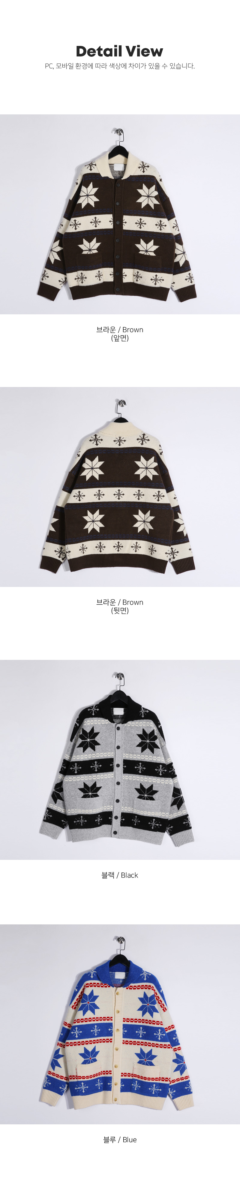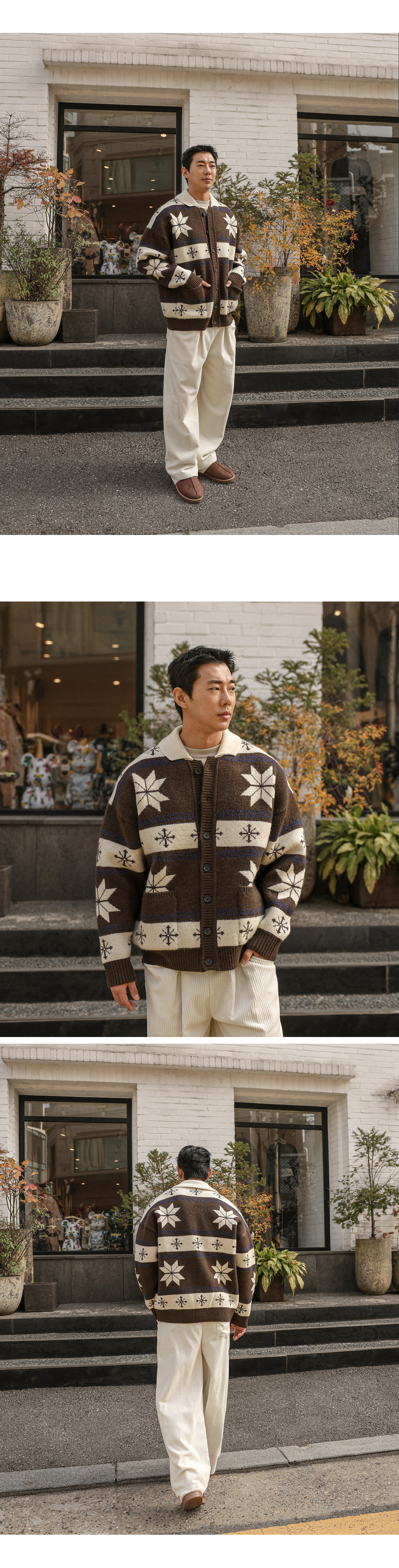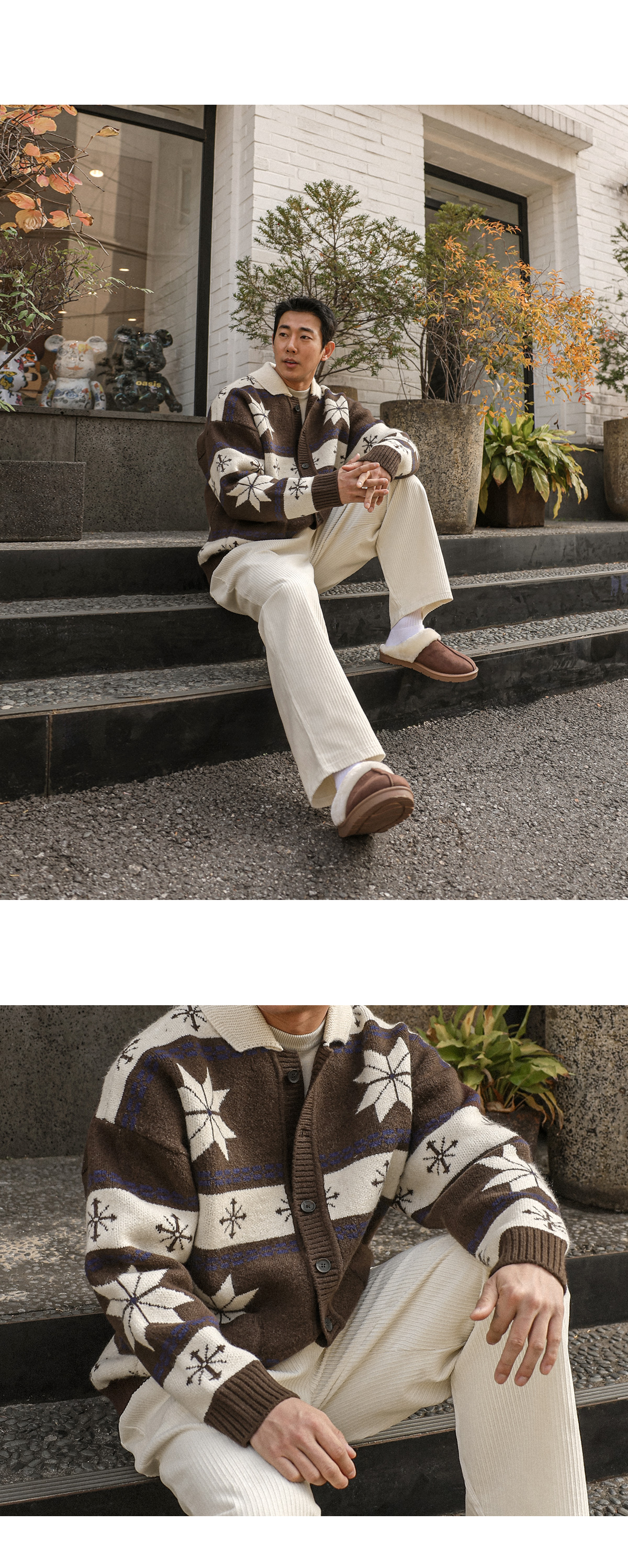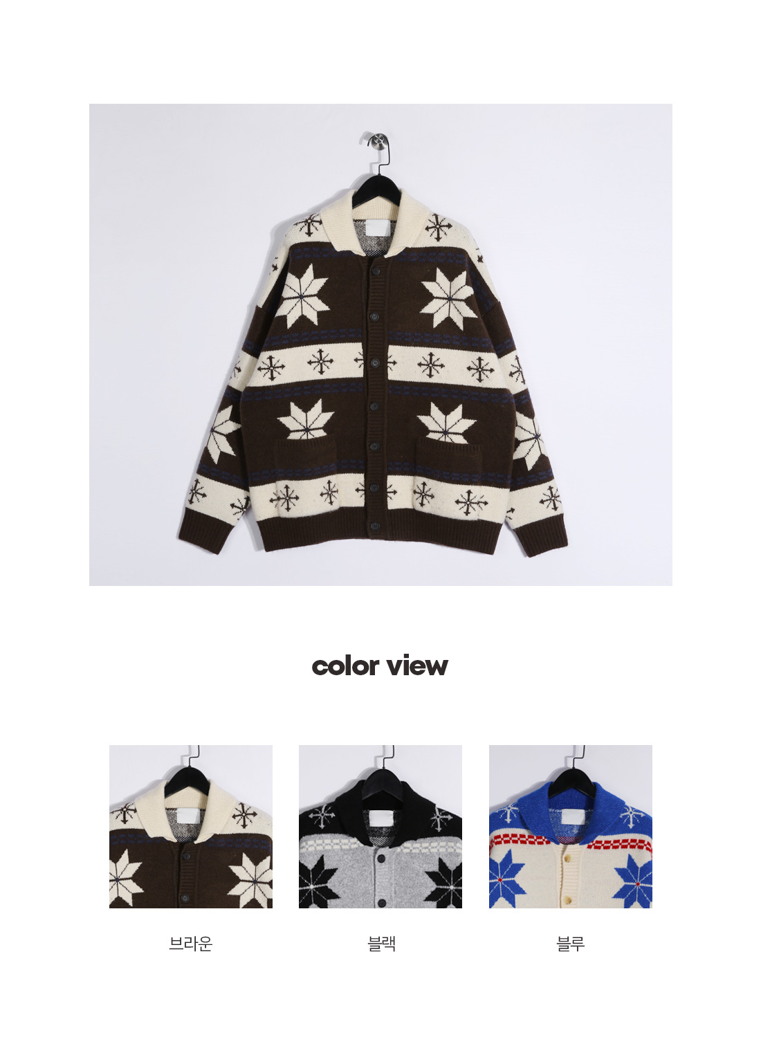 눈꽃 패턴이 매력적인 카라 가디건입니다. 적당한 두께감과 탄탄한 조직감으로 형태감을 깔끔하게 유지해주며, 피부에 자극 없이 부드럽고, 포근한 텍스처가 느껴집니다. 겨울 분위기에 잘 어울리는 과하지 않은 패턴으로 입기만해도 스타일리시한 가디건으로 추천드립니다. SIZE FREE 모델착용 [JUNBEOM]색상 : 브라운 / 사이즈 : FREE ![]() ![]() ![]() ![]() ![]() ![]() ![]() ![]()