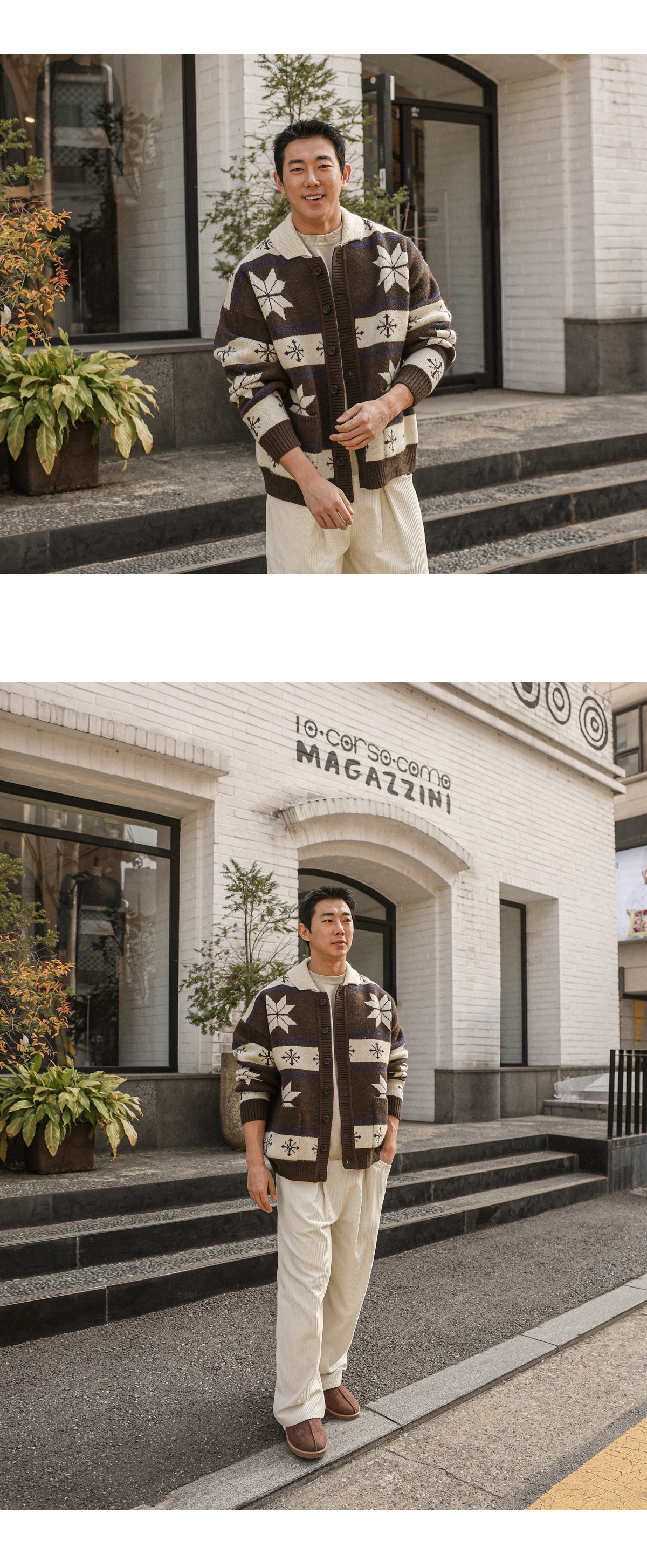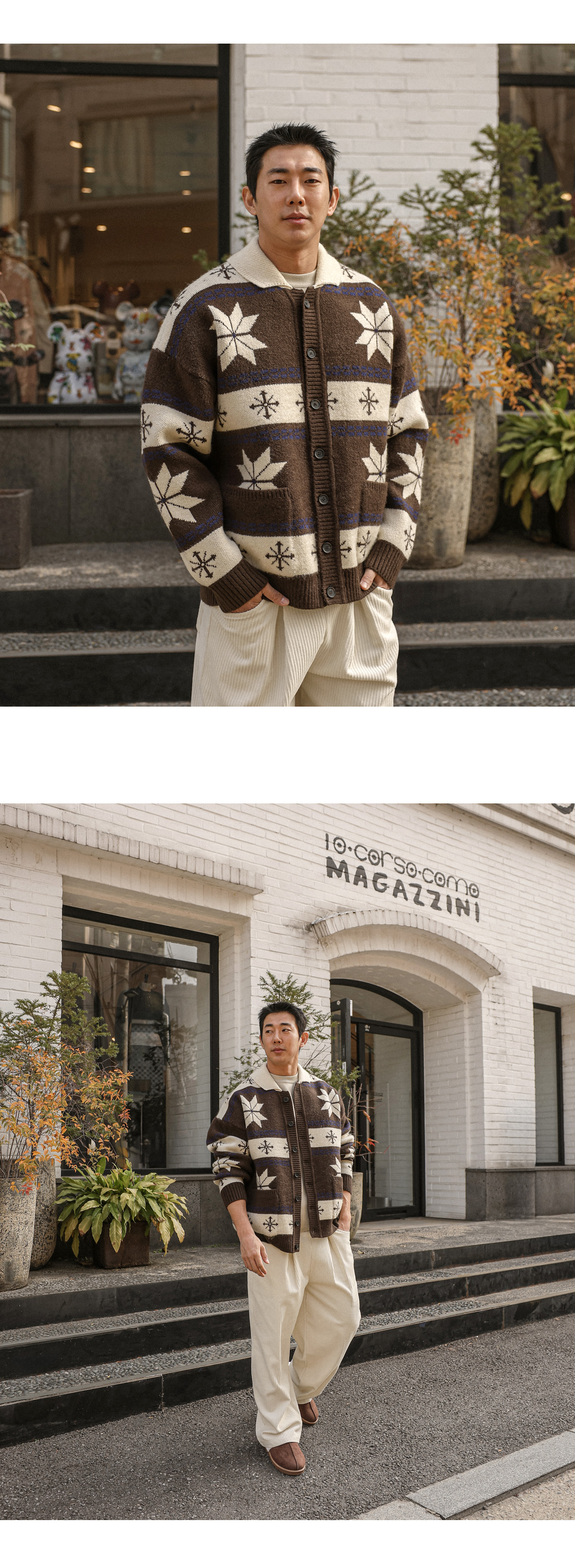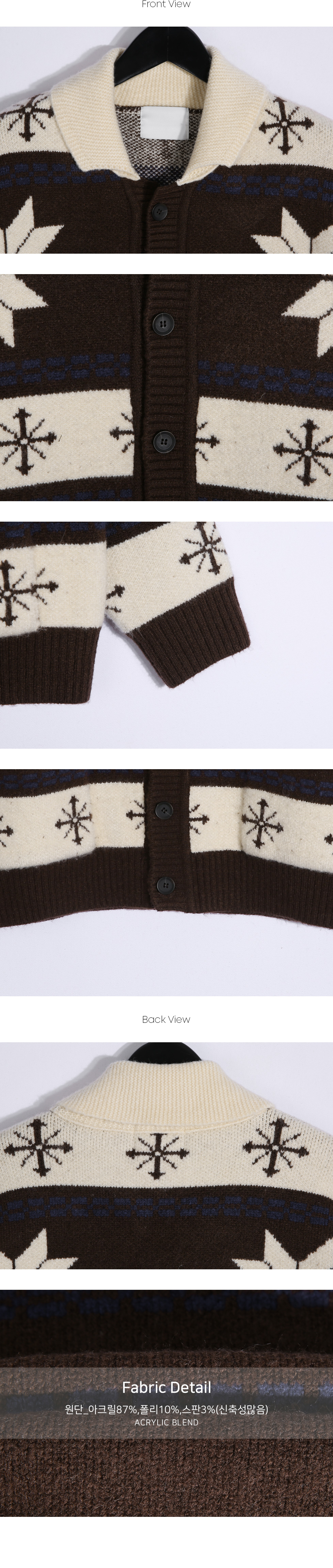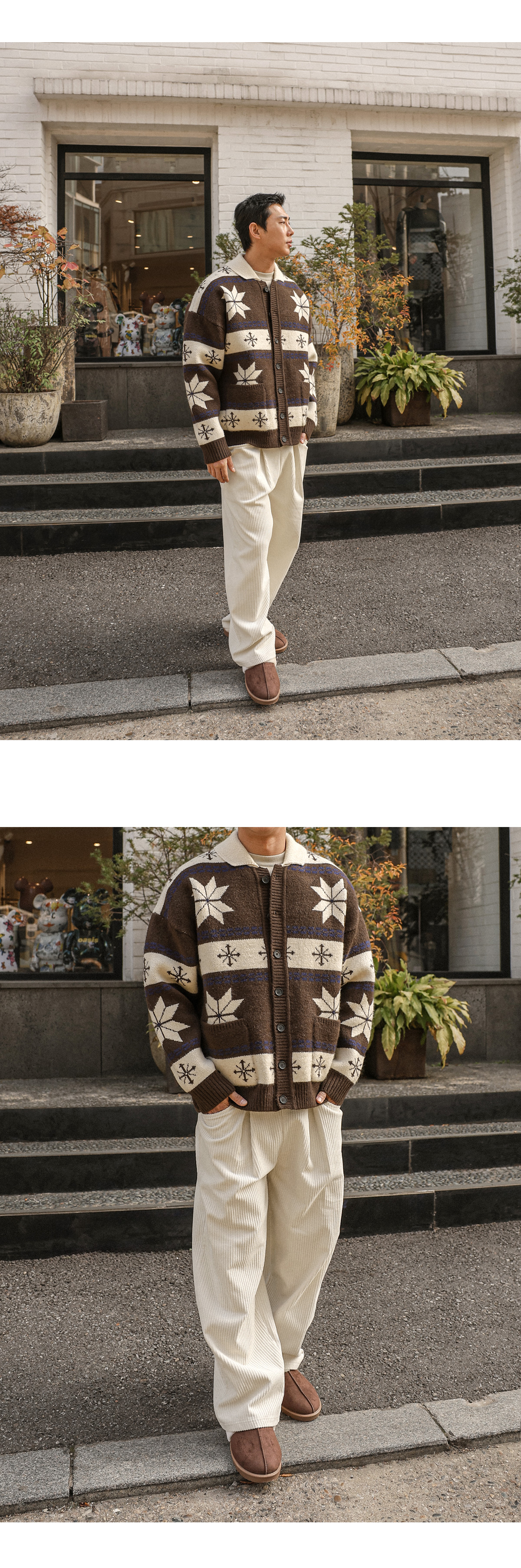 눈꽃 패턴이 매력적인 카라 가디건입니다. 적당한 두께감과 탄탄한 조직감으로 형태감을 깔끔하게 유지해주며, 피부에 자극 없이 부드럽고, 포근한 텍스처가 느껴집니다. 겨울 분위기에 잘 어울리는 과하지 않은 패턴으로 입기만해도 스타일리시한 가디건으로 추천드립니다. SIZE FREE 모델착용 [JUNBEOM]색상 : 브라운 / 사이즈 : FREE ![]() ![]() ![]() ![]() ![]() ![]() ![]() ![]()