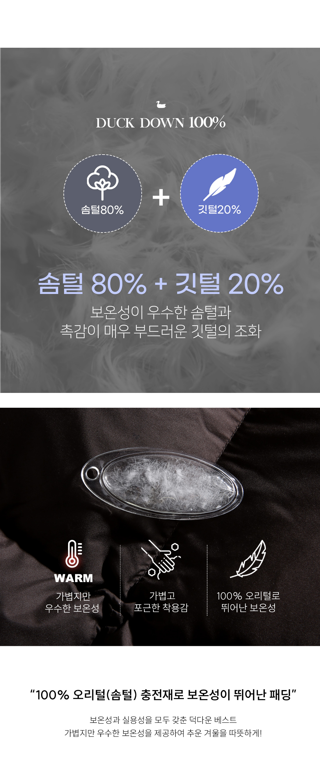다양한 이너와 레이어링 하기 좋은 덕다운 베스트입니다. 견고하고 부드러운 폴리 소재의 겉감과 덕다운 혼방 충전재를 사용하여 가볍지만 우수한 보온성을 제공합니다. 실용적인 사이드 포켓과 지퍼 구조로 설계되어 실생활에서의 편리함을 고려했으며, 양 사이드 절개 디테일은 은은한 포인트를 연출 해 줍니다. 실용적인 요소들로 일상과 아웃도어에 모두 적합한 아우터형 베스트입니다. SIZE FREE 모델착용 [YOOJUN]색상 : 브라운 / 사이즈 : FREE ![]() ![]() ![]() ![]() ![]() ![]() ![]() ![]()