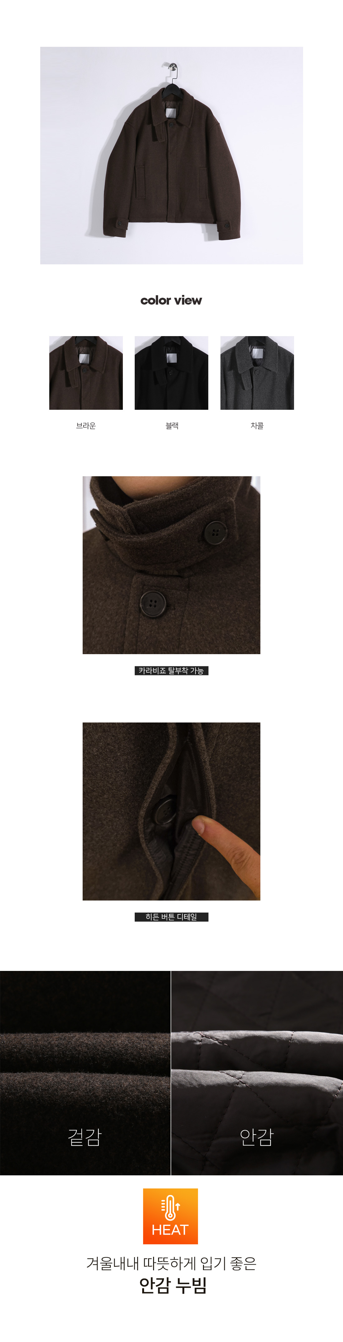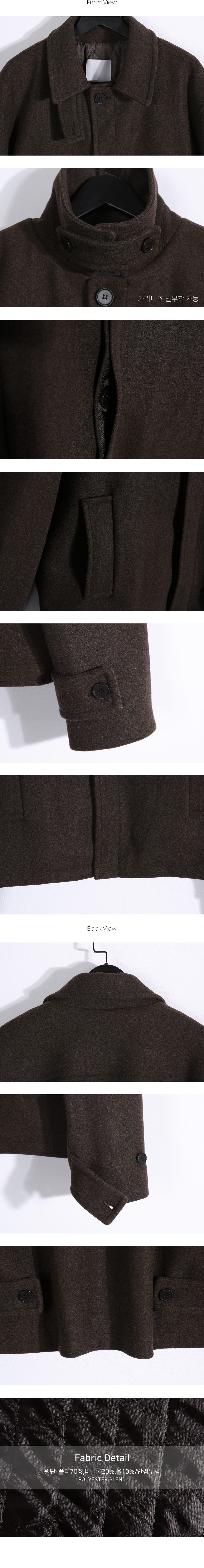 매 시즌 꺼내 입기 좋은 울 숏 하프 코트입니다. 부드러운 터치감과 포근한 착용감이 돋보이는 울 혼방 소재로 제작과 전체 누빔 안감을 더해 우수한 열 보전력을 자랑하며, 이너와의 마찰을 최소화했습니다. 넥라인의 히든 버튼 디테일로 깔끔한 클로징이 가능해 취향에 따라 하이넥 스타일로도 연출할 수 있습니다. 군더더기 없는 미니멀한 디자인으로 다양한 코디에 활용도 높은 아이템입니다. SIZE FREE 모델착용 [YOOJUN]색상 : 브라운 / 사이즈 : FREE ![]() ![]() ![]() ![]() ![]() ![]() ![]() ![]()
