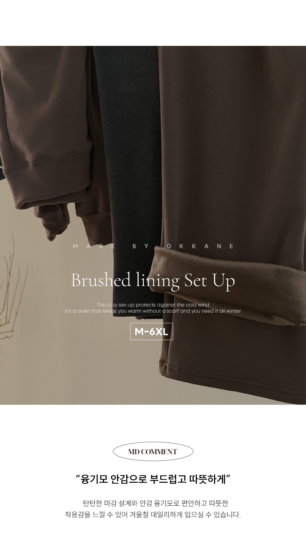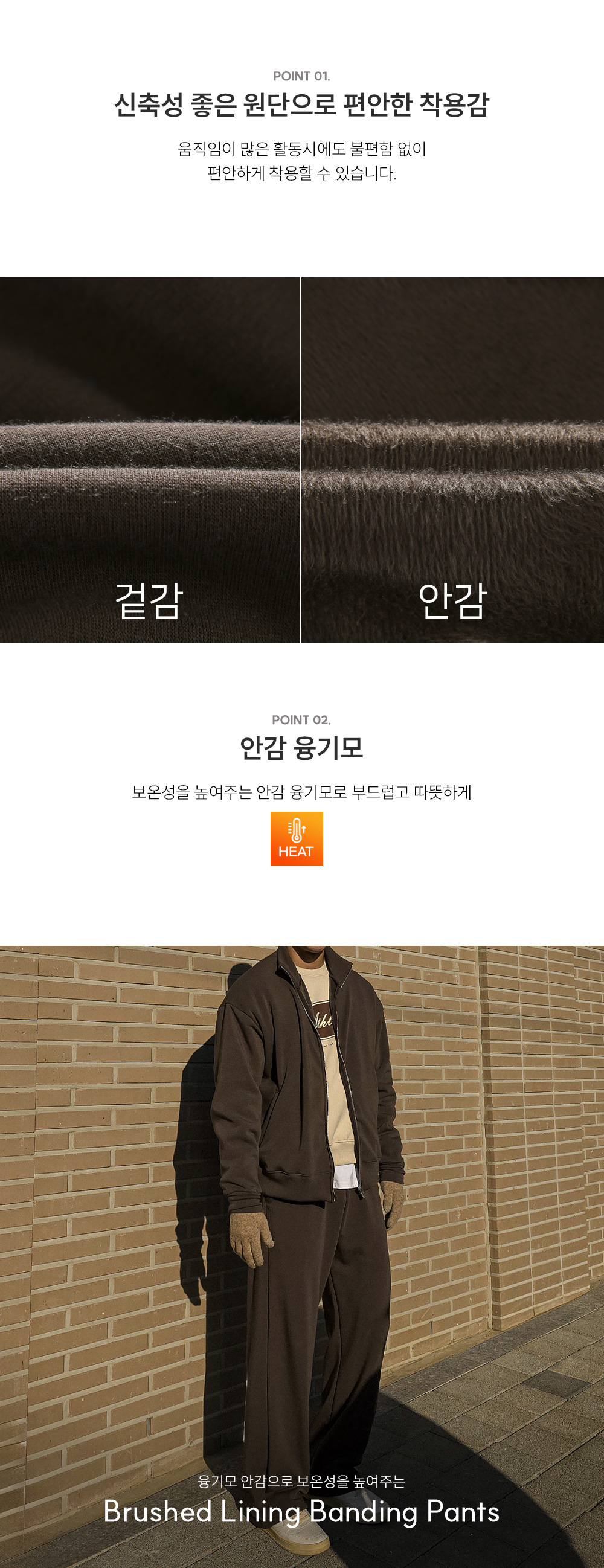 오까네에서 핏, 디테일 모두 신경써서 제작한 겨울철, 스타일링에 부담 없이 즐기기 좋은 융기모 팬츠입니다. 장시간 착용에도 불편함이 없도록 허리 전체 밴딩 처리와 허리끈을 더해 체형에 맞게 사이즈 조절이 가능합니다. 한겨울에도 우수한 열 보존력을 자랑하는 융기모 안감임에도 불구하고, 가벼운 무게로 제작되어 소프트한 감촉과 편안한 피팅감을 동시에 느끼실 수 있습니다. 불필요한 요소를 덜어낸 디자인으로 캐주얼, 꾸안꾸 등 다양한 상의와 매칭하실 수 있으며, 융기모 집업과 셋업 상품으로 세트로도, 단독으로도 활용할 수 있는 유용한 제품입니다. SIZE M-L,XL-2XL,3XL-4XL,5XL-6XL 모델착용 [JUNBEOM]색상 : 브라운 / 사이즈 : XL-2XL