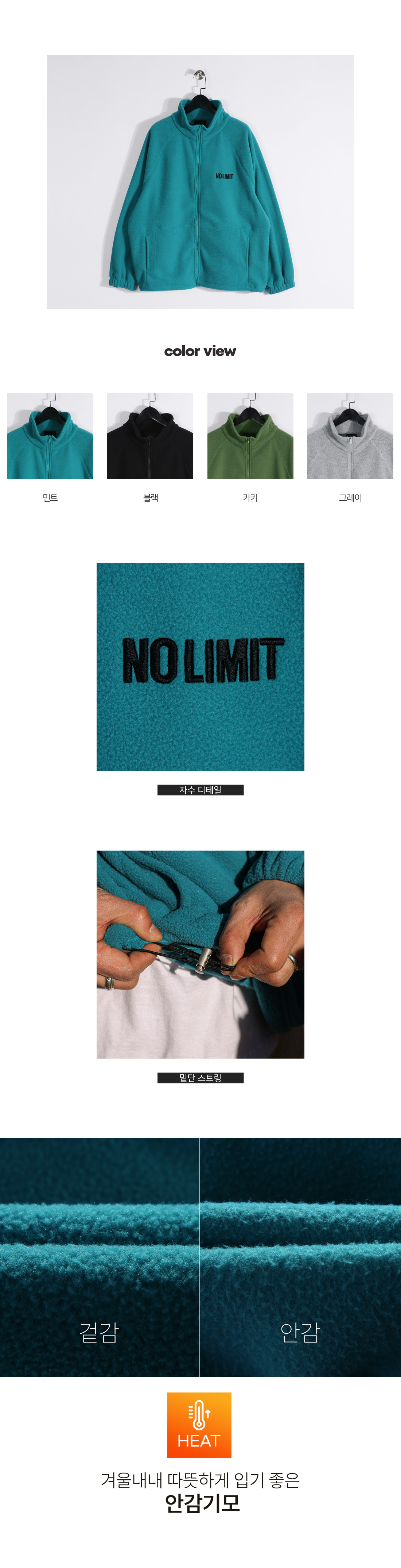 아무리 추운 겨울이라도 패션을 포기할 수 없다면, 후리스 집업을 소개합니다. 너무 흔한 정 핏 보다는 고객님들의 취향에 맞게 착용 가능한 스트링을 더해 조이지 않으면 이너를 여러겹 겹쳐 입어도 여유 있고, 조여서 코디를 하게 되면 볼륨감 있고 입체적인 아웃핏을 선사합니다. 보들보들 폴리 혼방 소재로 부드러운 텍스처를 자랑해 예민한 피부이신 분들도 충분히 착용이 가능하고, 적당한 두께감으로 차가운 바람을 막아줘 보온성을 높여주었습니다. 후리스 디자인과 어울리는 자수 레터링 디테일로 멋스러운 요소를 더해주었으며, 스판이 함유된 원단으로 움직임 많은 활동에도 안정적이고 거부감 없는 착용감을 선사합니다. 간절기부터 겨울까지 입기 좋은 후리스를 찾고 계시다면 하나쯤 소장해보시길 추천드립니다. SIZE FREE 모델착용 [KIHOON]색상 : 민트 / 사이즈 : FREE ![]() ![]() ![]() ![]() ![]() ![]() ![]() ![]() ![]()