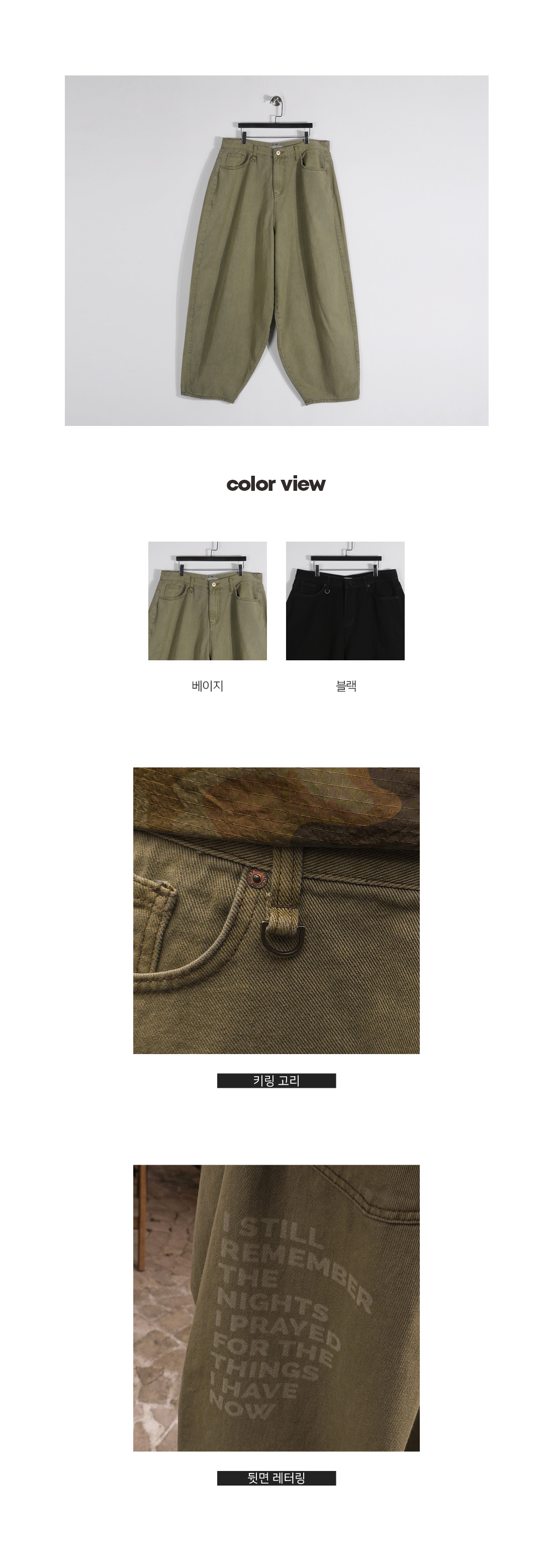 보기만 해도 힙한 분위기를 자아내는 면 팬츠입니다. 앞면 키링 고리 디테일로 키링과 함께 스타일리시하게 연출할 수 있으며 뒷면 배색 레터링으로 은은한 포인트를 더했습니다. 와이드한 핏으로 체형에 구애받지 않고 편안하게 착용 가능하며 후드, 맨투맨, 자켓, 반팔 티셔츠 등 다양한 아이템과 매치해 힙한 무드의 데일리룩부터 스트릿룩까지 연출하기 좋은 팬츠입니다. COLOR 베이지,블랙 SIZE M,L-XL 모델착용 [KIHOON]색상 : 베이지 / 사이즈 : L-XL